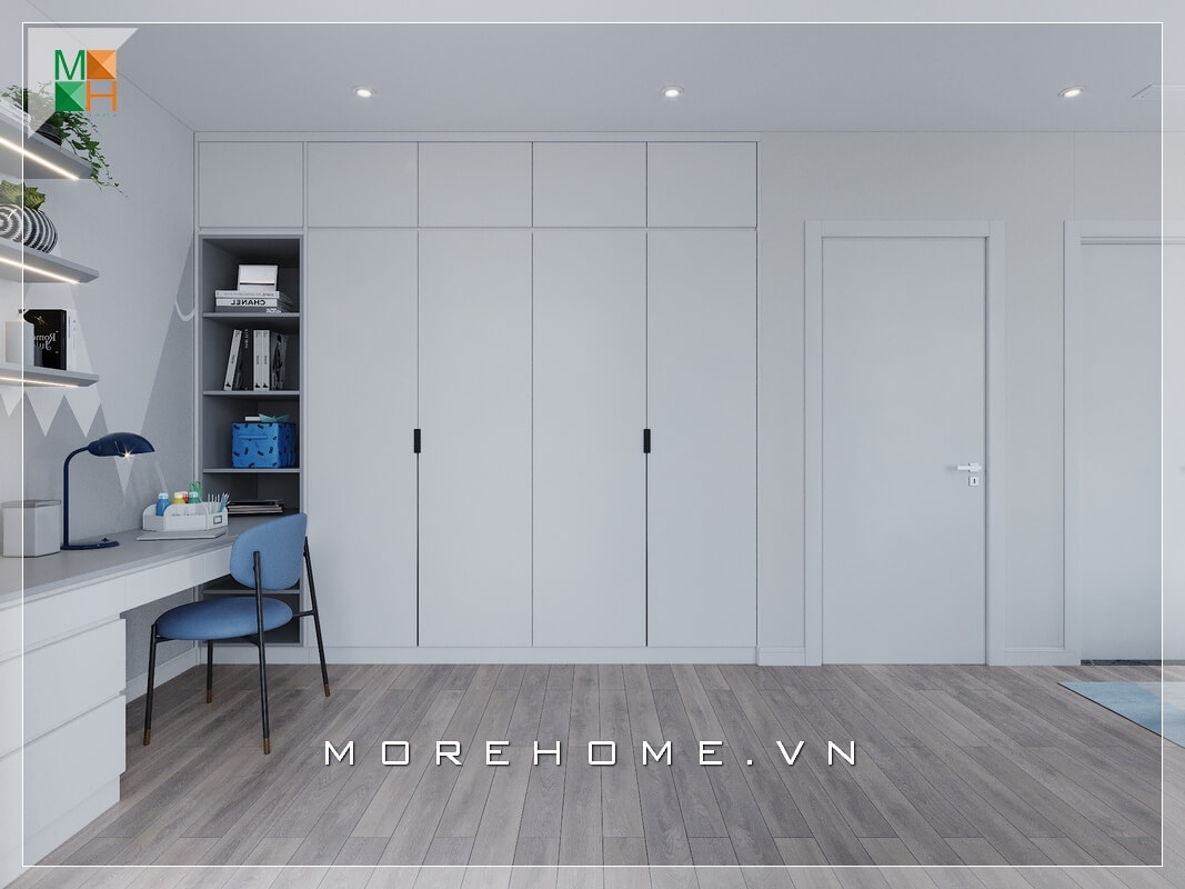 Ý tưởng thiết kế phòng ngủ của con tại biệt thự Vinhomes Imperia Hải Phòng tuy đơn giản nhưng lại khá độc đáo từ cách trang trí, bố trí kệ trang trí, bàn học, tủ để đồ và trước mặt như một khoảng trời lớn với các vì sao, đám mây đang bay lơ lửng sẽ là lợi ý khá độc đáo để quý vị tham khảo cho các bé của mình.
