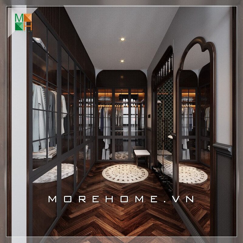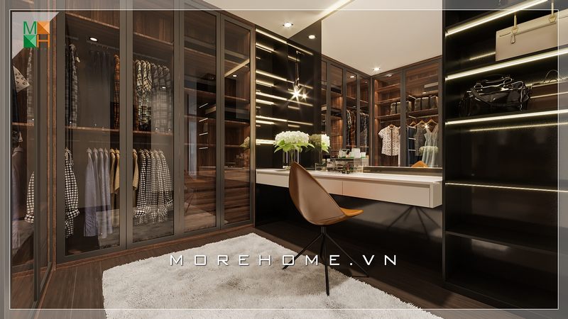 Không đơn thuần chỉ là một căn phòng để đồ đơn điệu của căn hộ chung cư, nhà phố, biệt thự mà nhà thiết kế rất sáng tạo khi thiết kế hai tủ đồ gỗ cánh kính hiện đại hai bên tường, vừa tận dụng được không gian mà còn thể hiện tính thẩm mỹ cao.