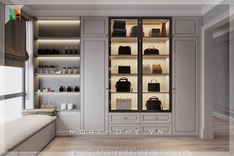 Tủ quần áo hiện đại kết hợp gỗ và kính sang trọng, trẻ trung lại tiện lợi để trưng bày túi xách phần nội thất đặc biệt trong thiết kế biệt thự, nhà phố