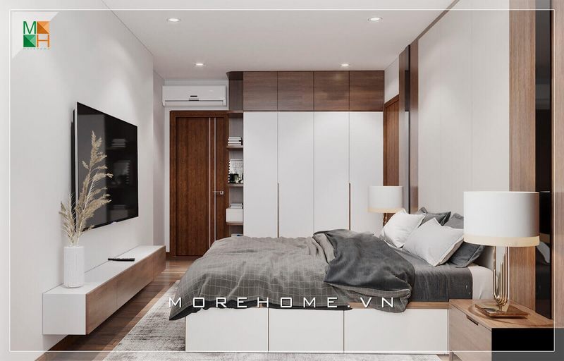 Mẫu tủ quần áo hiện đại thiết kế âm tường kịch trần rất thông minh và sáng tạo biến căn phòng ngủ chung cư trở nên sang trọng hơn.