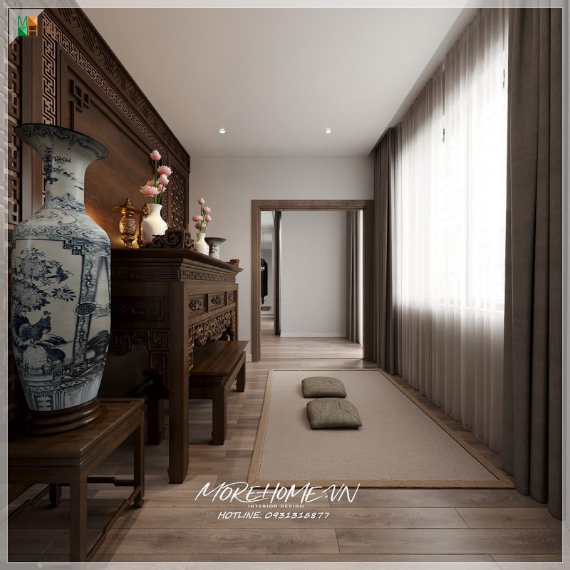 Theo quan niệm phong thủy, đặt bàn thờ theo hướng ra cửa sẽ thoát khí tốt như vậy sẽ không mang may mắn cho gia chủ nhưng bị giới hạn về diện tích phòng thờ không cho phép đã được che rèm hai bên phía trước.