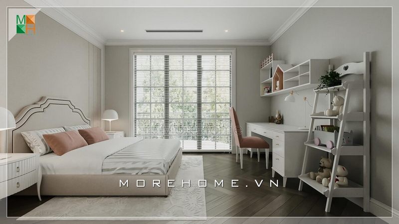 Thiết kế nội thất phòng ngủ hiện đại dành cho con gái đẹp cao cấp, tiện lợi hài hòa từ mẫu giường ngủ bọc da đến hệ thống tủ kệ tiện lợi.