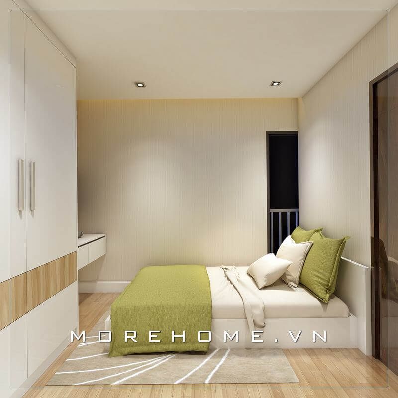 Không gian phòng ngủ được thiết kế đơn giản, hiện đại với gam màu trắng làm nổi bật. Chăn gối màu xanh nhẹ nhàng tạo ra một không gian tinh tế, yên tĩnh hơn.