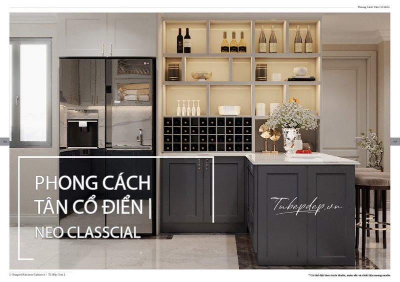 Mẫu tủ bếp có thiết kế chữ L, được làm từ gỗ công nghiệp với gam màu đồng nhất, cùng với nội thất âm tường giúp tiết kiệm được không gian nhưng vẫn mang lại sự sang trọng.