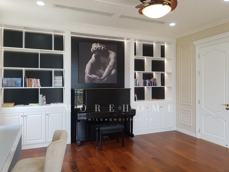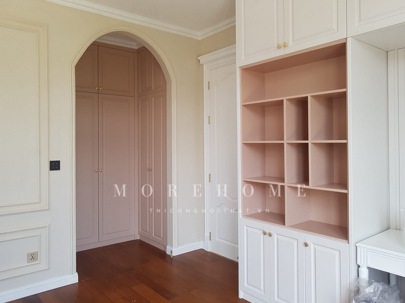 Tủ quần áo gỗ cao cấp với thiết kế kịch trần, kết hợp với kệ trang trí sẽ tạo nên vẻ đẹp sang trọng cho căn phòng của gia chủ.