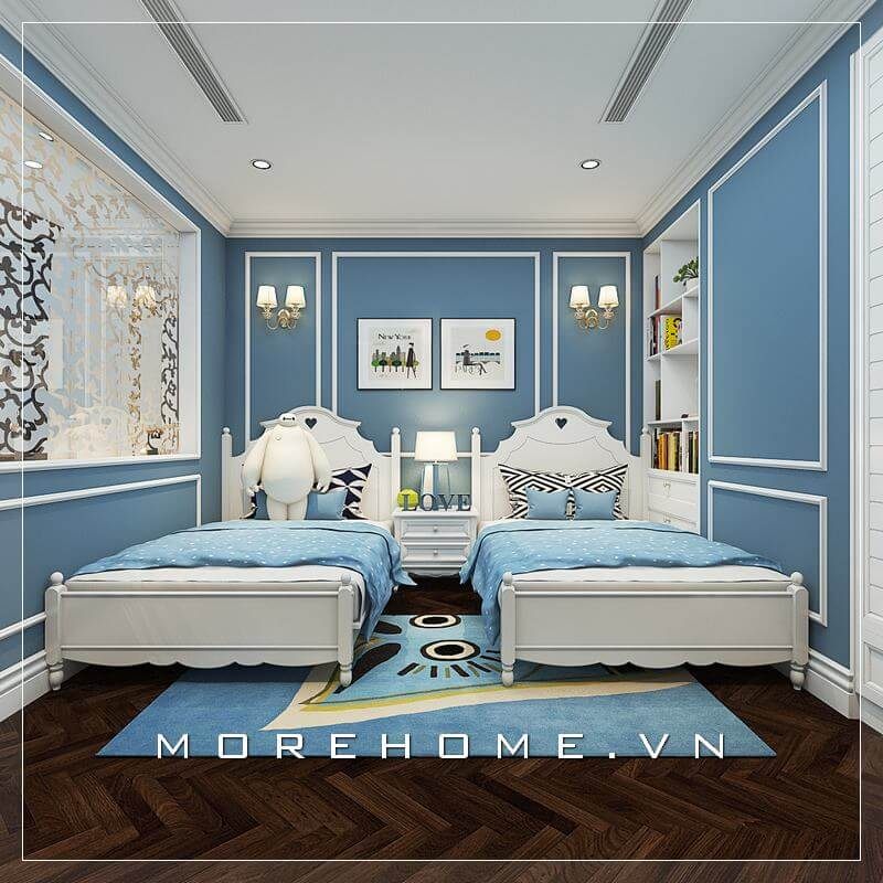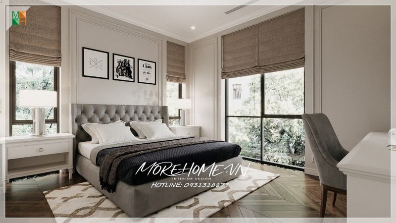 Không gian phòng ngủ của nhà phố, biệt thự được thi công theo phong cách tân cô điển với màu trắng làm chủ đạo, góp phần tạo nên sự tiện nghi và thoải mái.